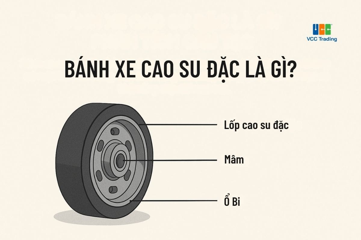 Bánh xe cao su đặc là loại bánh xe được đúc nguyên khối từ cao su, không có ruột hơi bên trong. Cấu trúc vững chắc này mang lại độ bền cơ học và khả năng chịu tải vượt trội. Một bánh xe tiêu chuẩn gồm 3 thành phần chính: