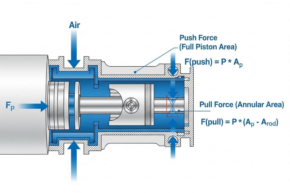 Để áp dụng vào thực tế, chúng ta cần cụ thể hóa công thức F = P x A cho hai trường hợp phổ biến nhất của xi lanh: khi piston đi ra (lực đẩy) và khi piston đi vào (lực kéo).