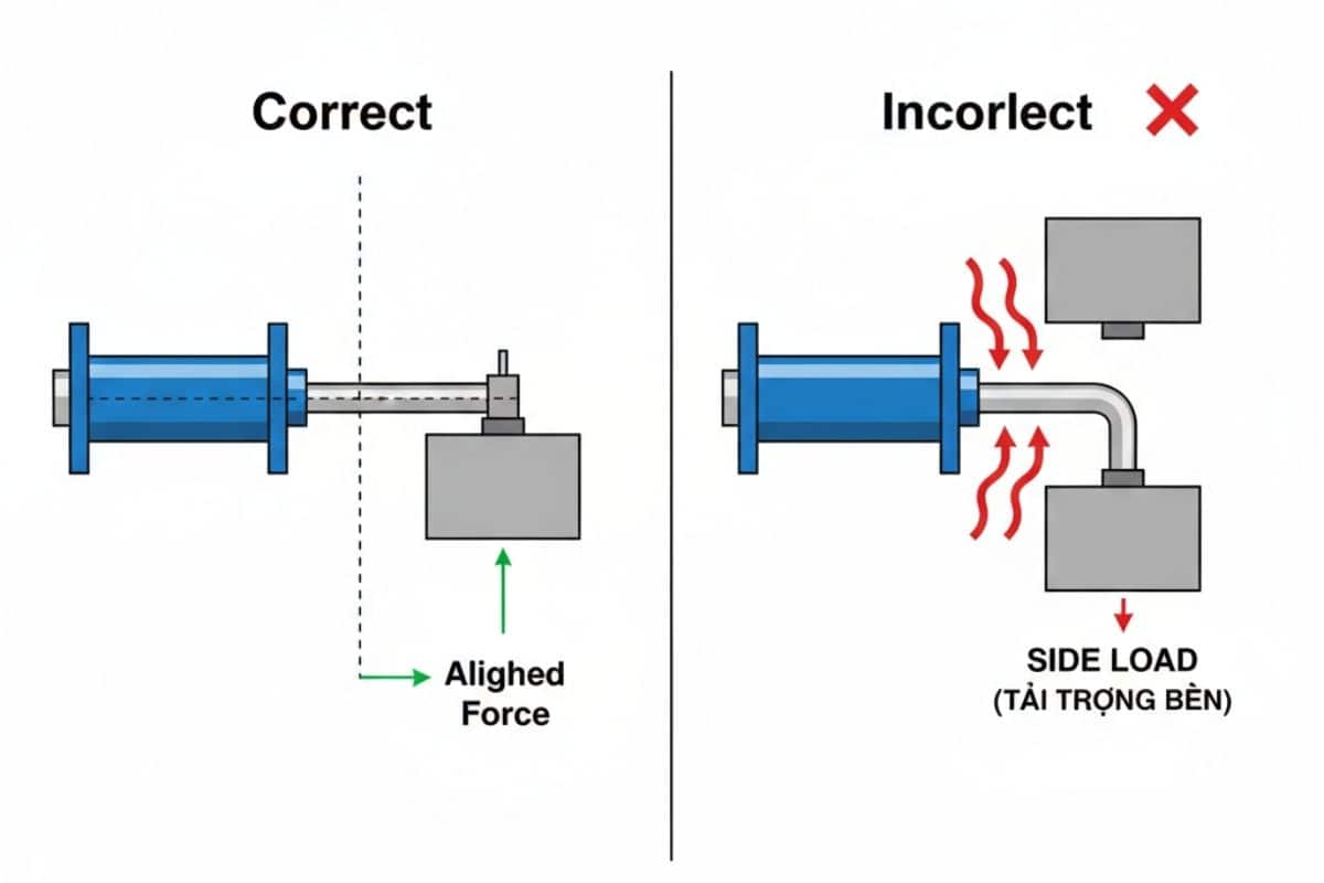 Đây là lỗi nghiêm trọng và phổ biến làm giảm tuổi thọ xi lanh. Khi lắp đặt, trục của ty xi lanh và trục của tải phải tuyệt đối thẳng hàng (đồng trục). Nếu lắp bị lệch (misalignment), khi xi lanh đẩy tải, một lực uốn (gọi là tải trọng bên – side load) sẽ tác động ngang lên ty xi lanh. Lực này làm mòn phốt cổ trục (rod seal) và bạc đạn dẫn hướng một cách không đồng đều, gây xước ty, xước nòng, và cuối cùng là kẹt cứng xi lanh.