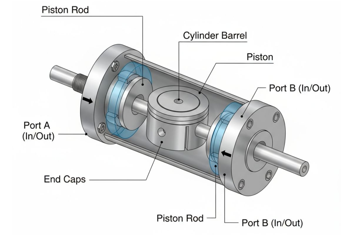 Mỗi chiếc xi lanh, dù đơn giản hay phức tạp, đều được cấu thành từ các bộ phận chính với chức năng riêng biệt, phối hợp nhịp nhàng để tạo ra chuyển động: