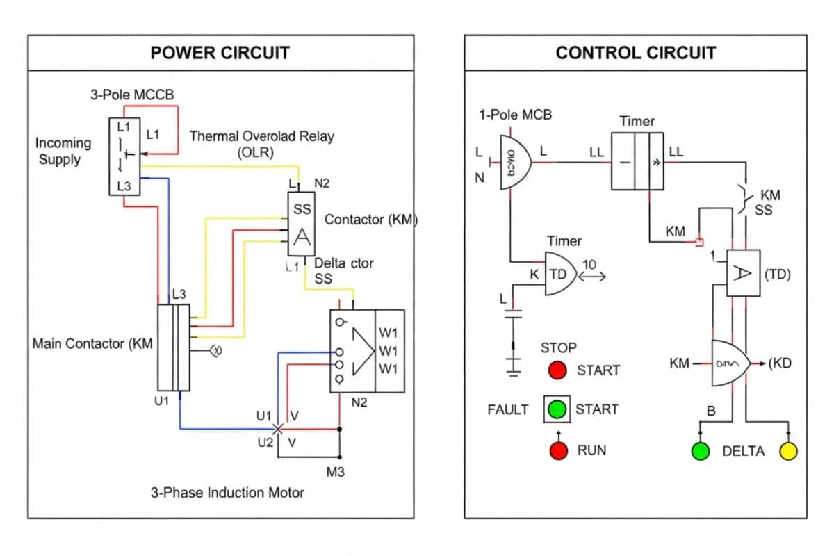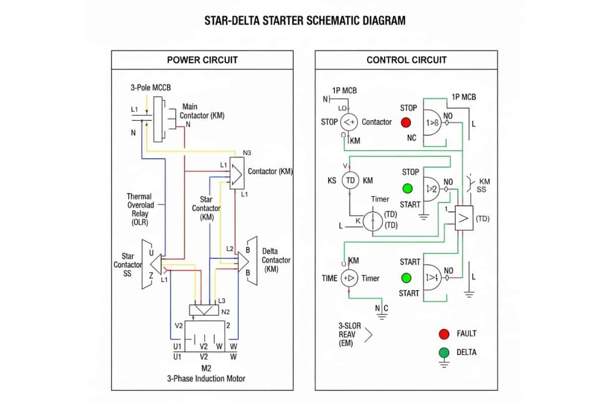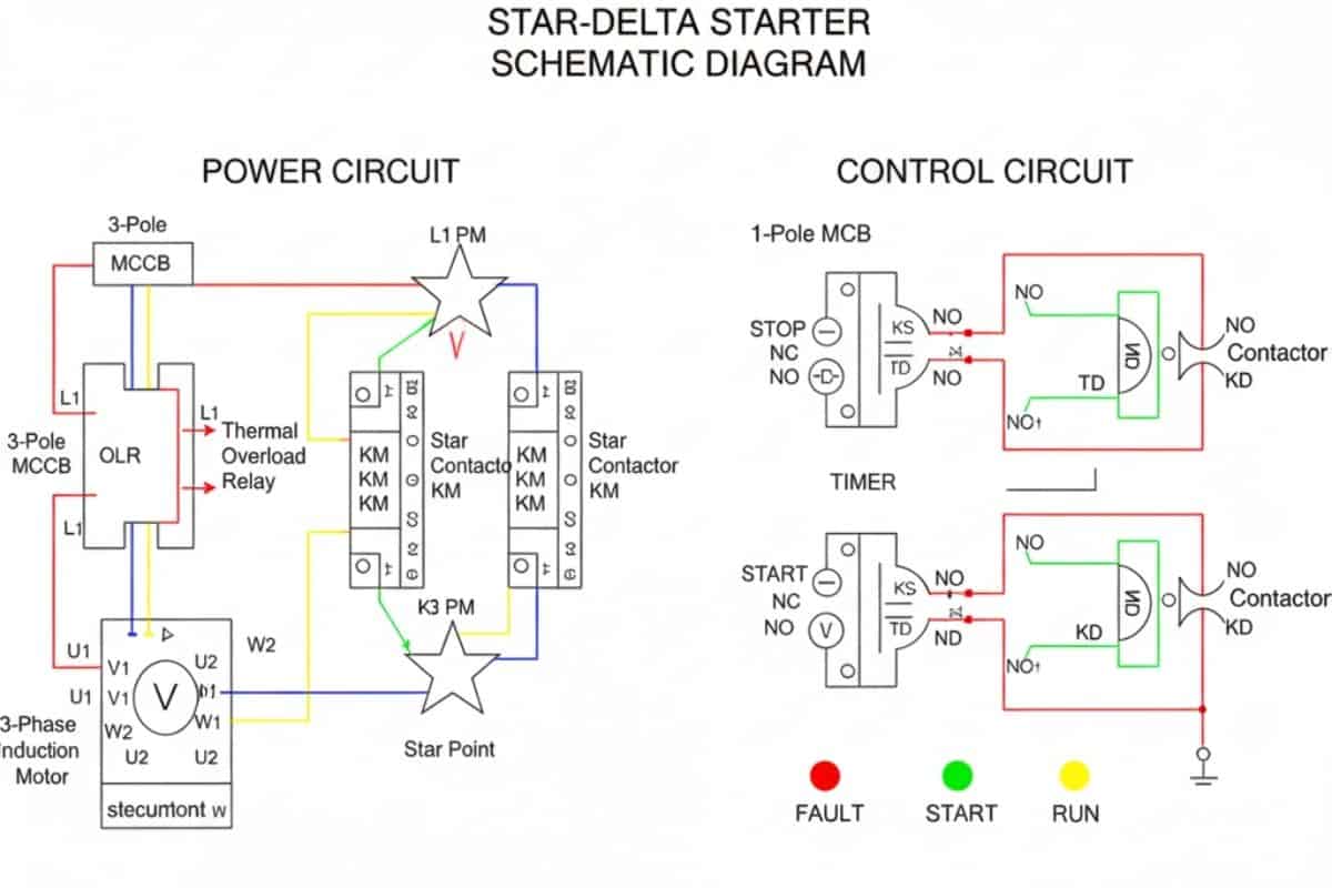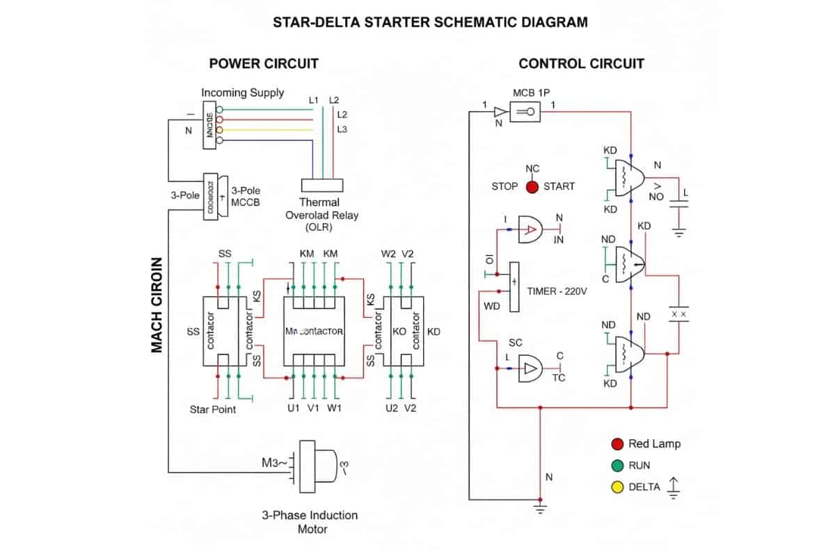 Mạch khởi động sao tam giác (Star Delta Starter) là một phương pháp đấu nối động cơ điện 3 pha nhằm mục đích giảm dòng điện trong quá trình khởi động. Ban đầu, các cuộn dây của động cơ được đấu theo hình Sao (Star – Y) để chạy ở mức điện áp và dòng điện thấp. Sau một khoảng thời gian nhất định, khi động cơ đã đạt được tốc độ quay gần ổn định, mạch sẽ tự động chuyển đổi các cuộn dây sang đấu theo hình Tam giác (Delta – Δ) để động cơ chạy ở đúng công suất định mức.