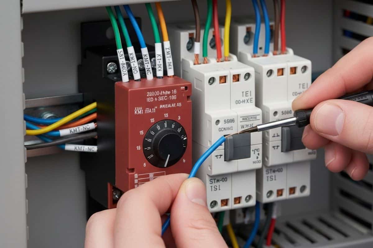 Chuẩn bị đầy đủ dụng cụ: tuốc nơ vít, kìm tuốt dây, kìm bấm cốt, đồng hồ VOM. Kiểm tra các thiết bị: contactor, rơ le, timer có đúng thông số và hoạt động tốt không.