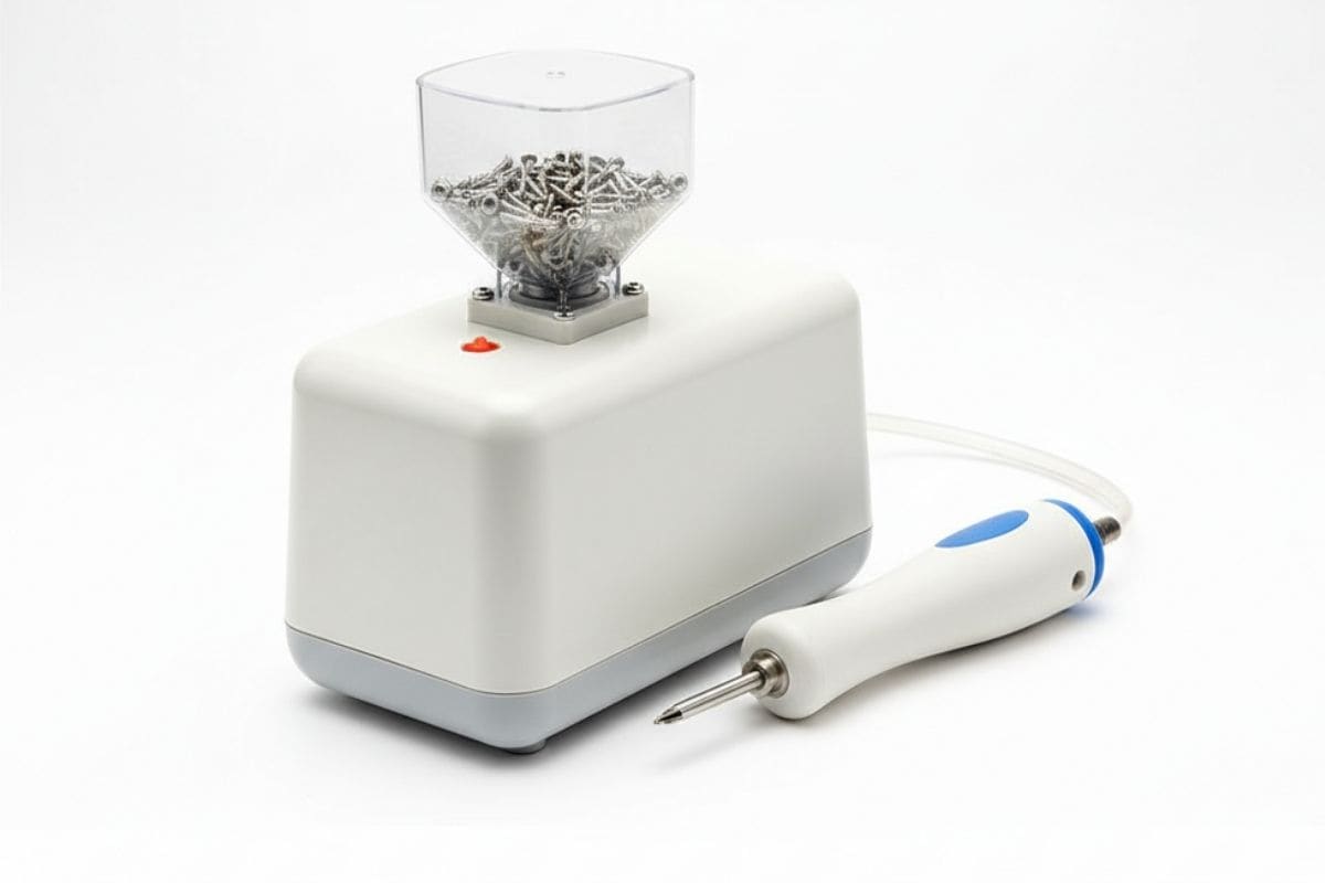 Hình ảnh một máy cấp vít tự động cầm tay đặc trưng, thể hiện sự nhỏ gọn và linh hoạt.