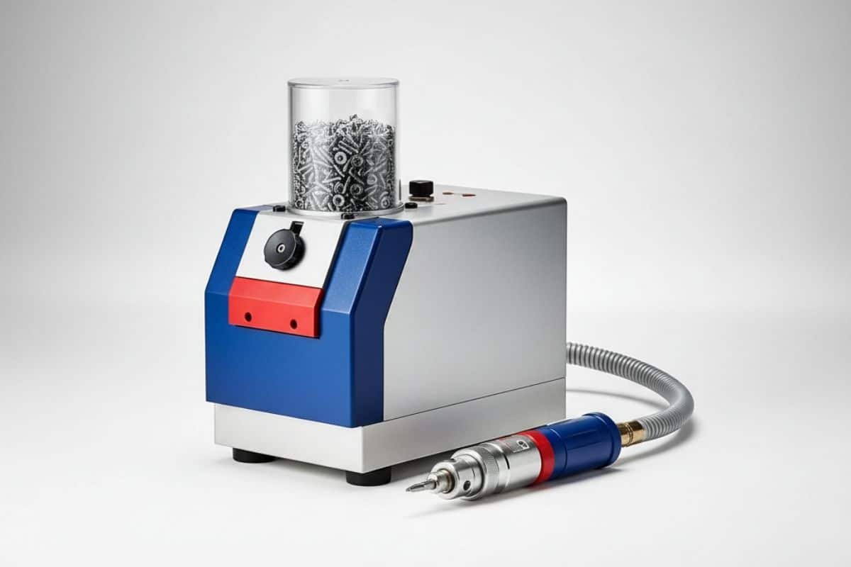 Cận cảnh máy cấp vít tự động đang nạp một con vít chính xác vào đầu tô vít điện.