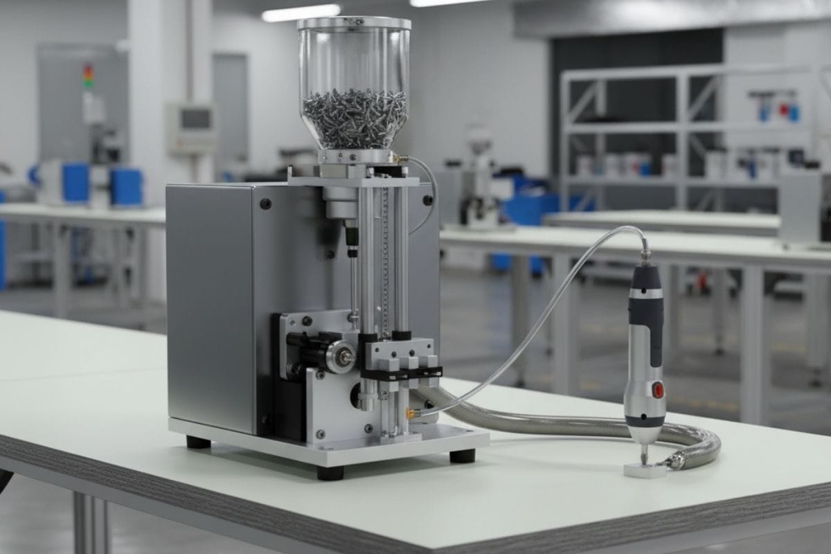 Minh họa máy cấp vít tự động nhỏ gọn dễ vận hành cho các xưởng sản xuất nhỏ.