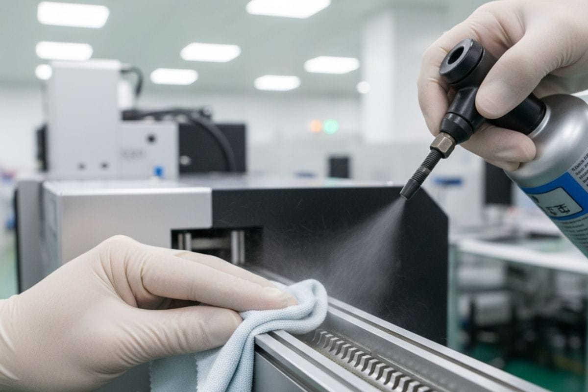 Kỹ thuật viên đang thực hiện bảo trì, vệ sinh máy cấp vít tự động để đảm bảo hoạt động bền bỉ.