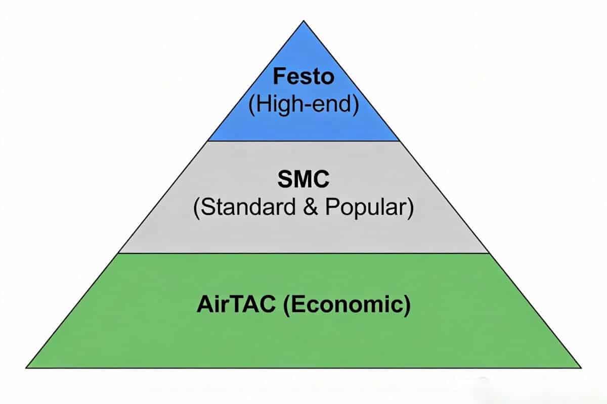 - AirTAC: Đại diện cho sự linh hoạt và tối ưu chi phí của nền sản xuất Đài Loan. AirTAC thống trị phân khúc phổ thông và các ứng dụng yêu cầu thu hồi vốn nhanh, với lợi thế cạnh tranh tuyệt đối về giá thành.