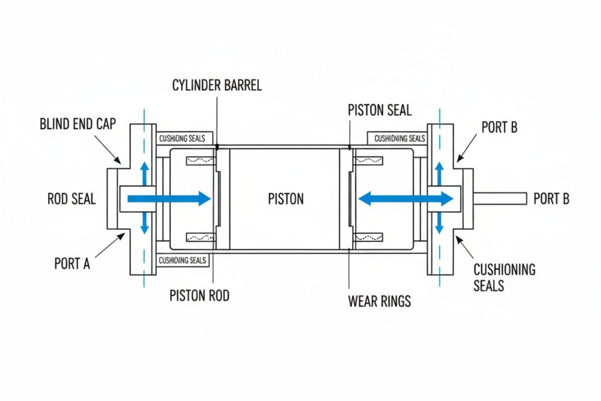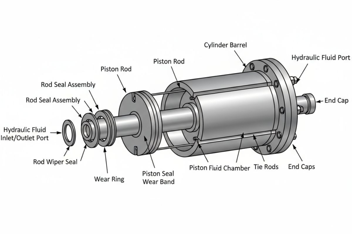 Cấu tạo chính: Phức tạp hơn xi lanh khí nén, bao gồm vỏ xi lanh chịu lực cao, piston, trục piston, và các loại gioăng phớt chuyên dụng để ngăn rò rỉ dầu ở áp suất lớn.
