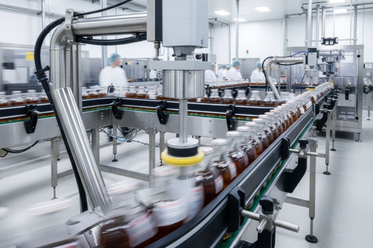 Một dây chuyền đóng chai cần các cơ cấu hoạt động với tốc độ cực nhanh để đóng nắp, dán nhãn, và di chuyển sản phẩm. Tải trọng của các chai nước rất nhẹ. Quan trọng nhất, môi trường sản xuất phải tuyệt đối sạch sẽ. Đây là sân khấu hoàn hảo cho xi lanh khí nén thể hiện tất cả ưu điểm của mình.