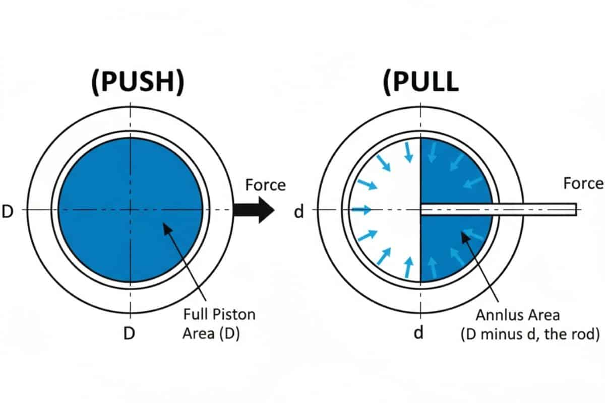 Công thức tính diện tích A = (pi x D^2) / 4 ở trên là tính cho lực đẩy (khi xi lanh đi ra). Đối với xi lanh tác động kép (loại phổ biến nhất), lực kéo về sẽ yếu hơn, và đây là một chi tiết kỹ thuật quan trọng thường bị bỏ qua.